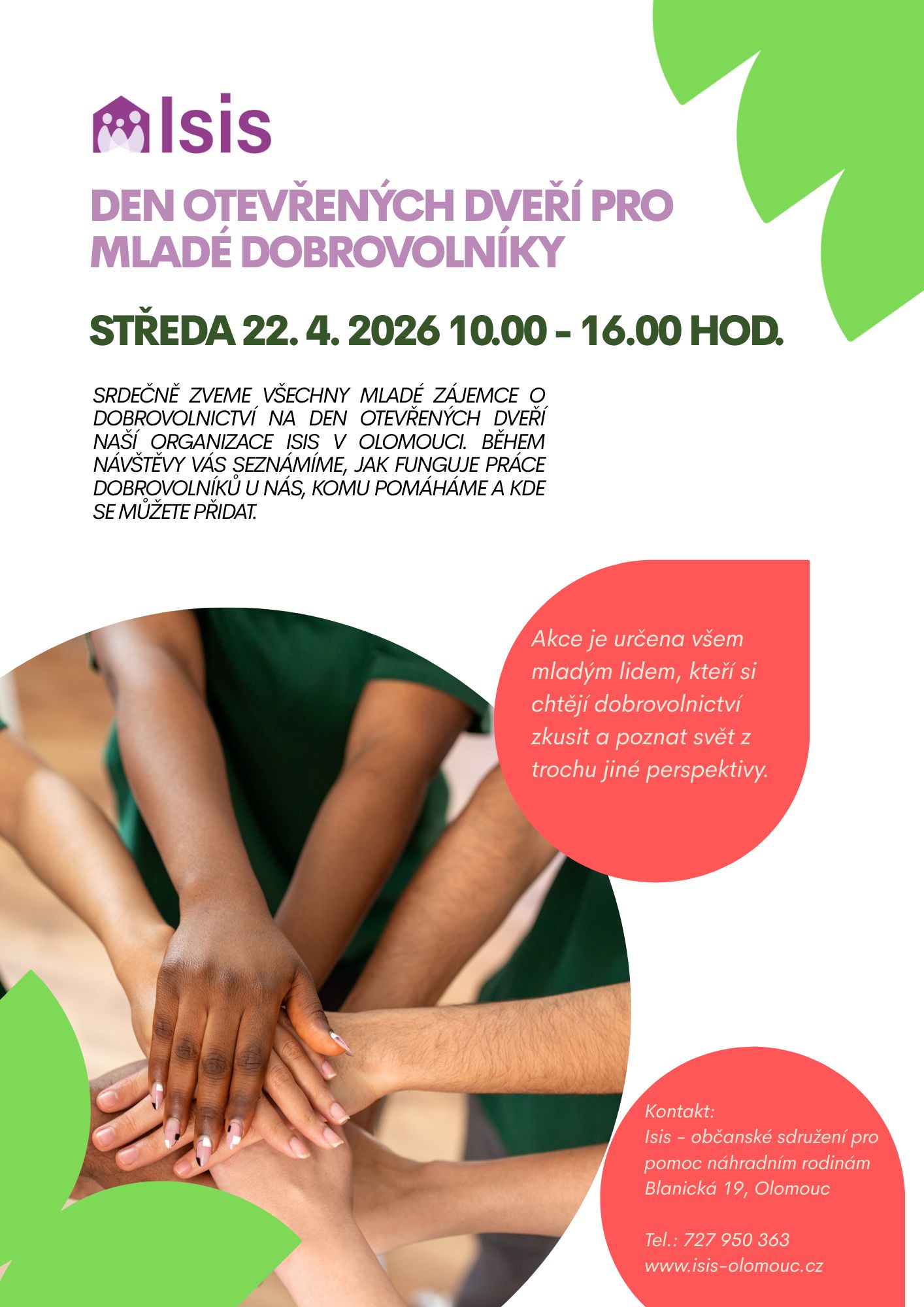 Srdečně zveme všechny mladé zájemce o dobrovolnictví na Den otevřených dveří naší organizace Isis v Olomouci. Během návštěvy vás seznámíme, jak funguje práce dobrovolníků u nás, komu pomáháme a kde se můžete přidat, co si můžete vyzkoušet a co vám to přinese.