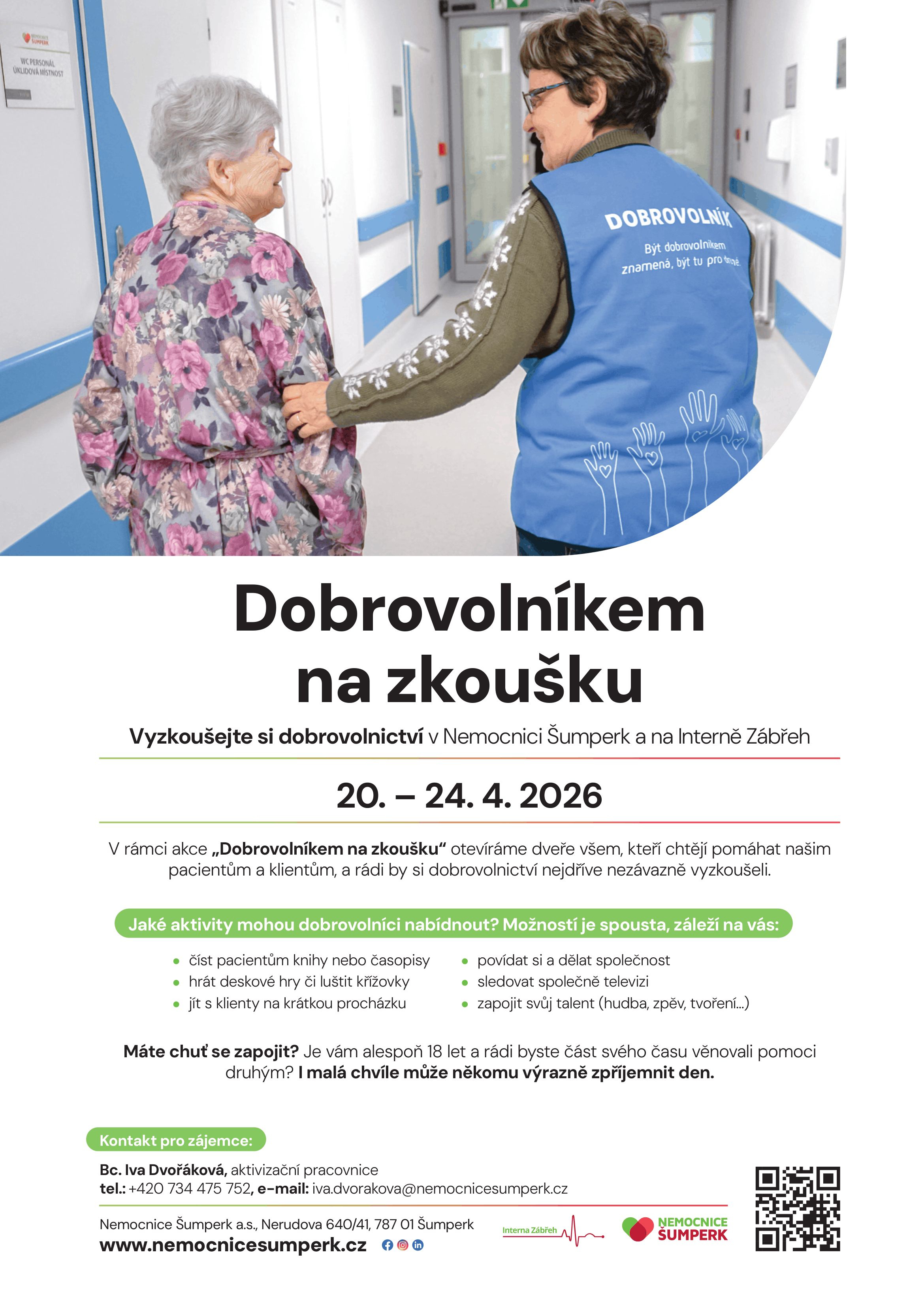 Přijďte si vyzkoušet možnost být dobrovolníkem přímo ve zdravotnickém prostředí na Ošetřovatelském úseku Nemocnice Šumperk a na Interním oddělení v Zábřehu.