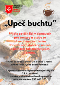 Zaregistrujte se na e-mailu: stepanka.malinova@maltezskapomoc.cz. Přesný termín společného setkání nad upečenými dobrotami bude včas upřesněn ve spolupráci se sociálními službami města Uherské Hradiště.